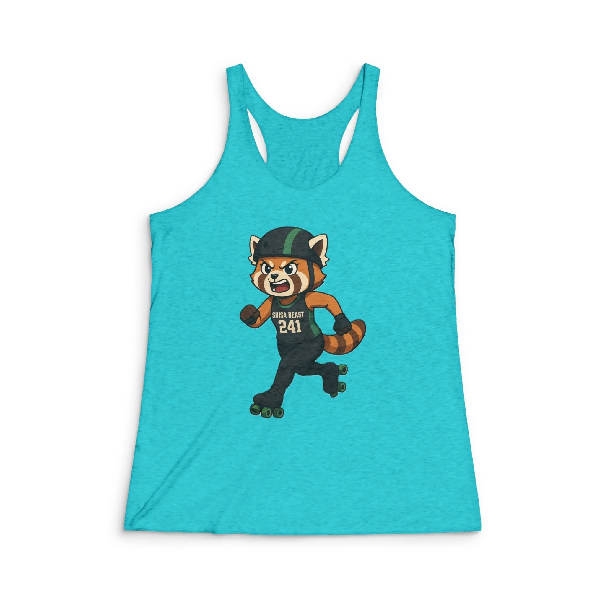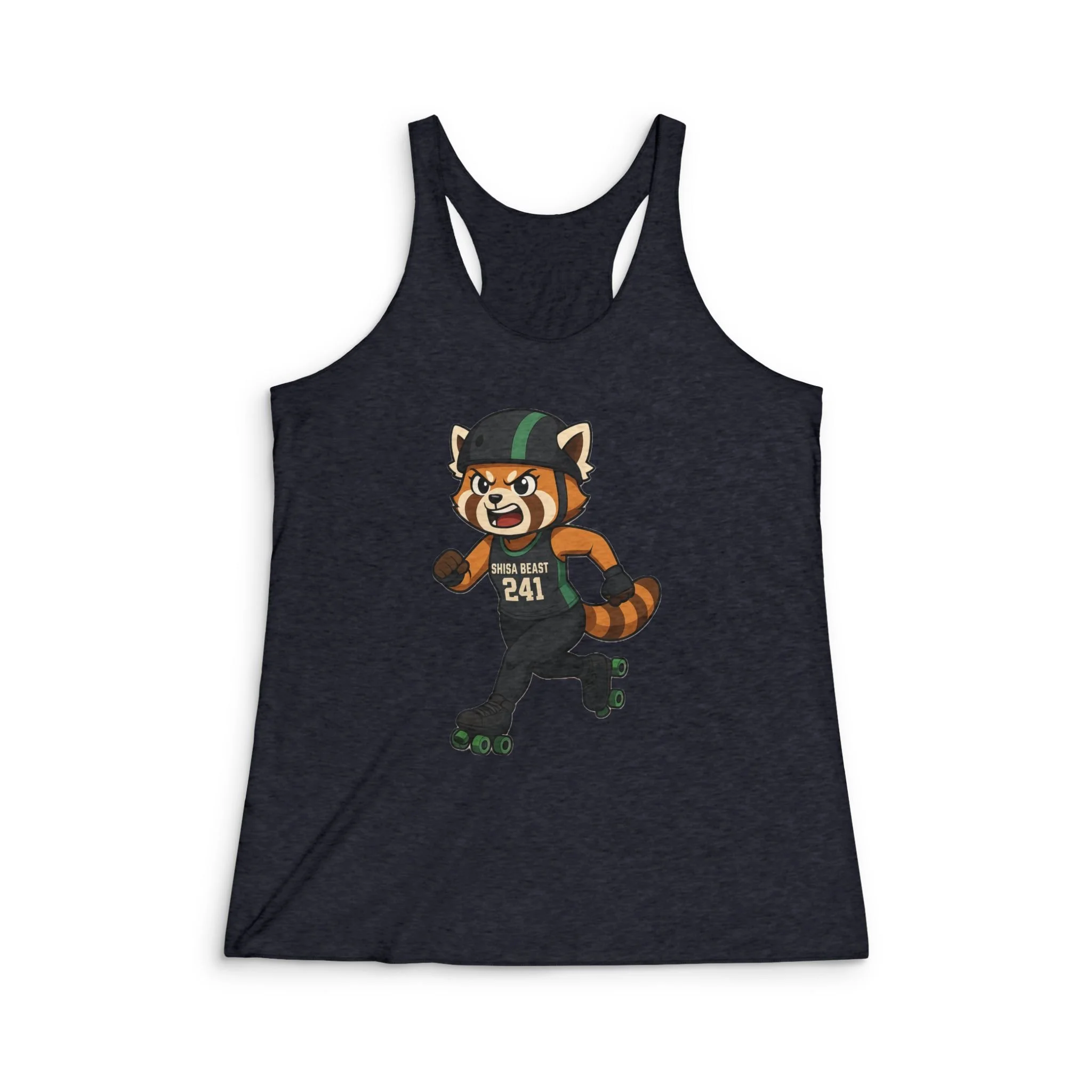 Light, breathable, and cut for movement — this slim-fit racerback tank carries a playful roller-derby red panda mascot across the front, ready to join weekend scrimmages or casual city strolls. The tri-blend fabric drapes softly against skin and keeps you cool during warm-weather practices or long days on the go. Side seams hold the shape through repeated wear, while the narrow overlock binding gives the armholes and neck a slightly edgy, athletic finish. Wear it layered under a flannel for post-game coffee runs or solo with leggings for speed work; it moves with you and keeps the vibe spirited and active.